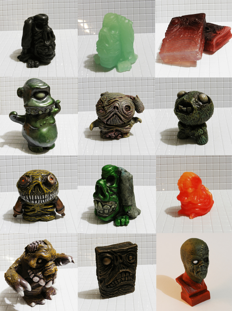 It’s been a little quiet over at We Become Monsters for a while, but with Halloween approaching tonight and the WBM containment fields falling (!), Chris Moore has no choice but to release a slew of new creatures upon the unsuspecting art toy community! Featuring a quite simply staggering array of customs, all-new resins, plus a whole host of returning WBM favourites including 3″ and 6″ versions of the Death Door, Ghasps and Necrolameicons, all have been finished in a variety of different colours including the rather impressive looking cold cast bronze editions. With prices ranging from just $3 up to $90 for the more substantial custom pieces, there really is something for all lovers of resin. Expect all the pictured goodies (plus a whole lot more!) to hit the WBM store at some point later today (October 31st)… On top of all the Halloween madness, the WBM Galaxy Frankenstein Bust competition will also be closing at 12pm tonight. Each 2″ mini-bust sale gives the purchaser a chance at winning a larger, fully painted, quarter scale figure, so be sure to get your order in today if you’re interested! Around 20 are left in stock at the time of writing…