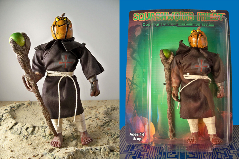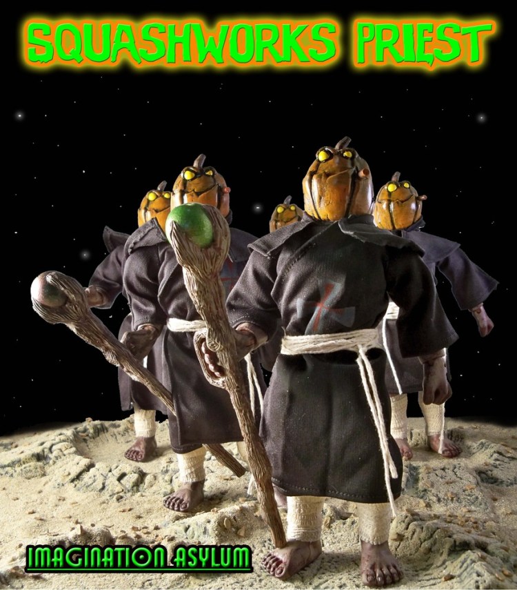 Imagination Asylum are proud to reveal their latest resin action figure this week in the form of the awesome Squashworks Priest! A prelude to their forthcoming Squahwork Orange character, the MEGO styled 8″ figure has been hand cast, coming complete with druid cloak, magic spell casters staff and menacing Jack’O Lantern head. Packaged in an authentic blister card, the Squahworks Priest is available in strictly limited numbers through the Imagination Asylum store for just $35 plus shipping… Stay tuned for more info on the Squahwork Pumpkin as soon as we get it!