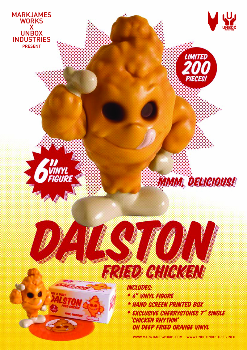 Mark James Works (of CardBoy fame) has teamed up with the guys over at Unbox Industries for the release of his latest designer toy, the ‘hot and tasty’ Dalston Fried Chicken vinyl figure! Standing at 6″ tall, the cheeky looking drumstick comes as part of a 3 piece set including the exclusive Cherrystones 7″ single ‘Chicken Rhythm’ on “Deep Fried” orange vinyl (yes, you read that right!), plus an authentic hand screen printed fried chicken-style take out box! Limited to just 200 sets, the finger lickin’ Dalston will be heading to selected stores and online at the Unbox Industries store soon…