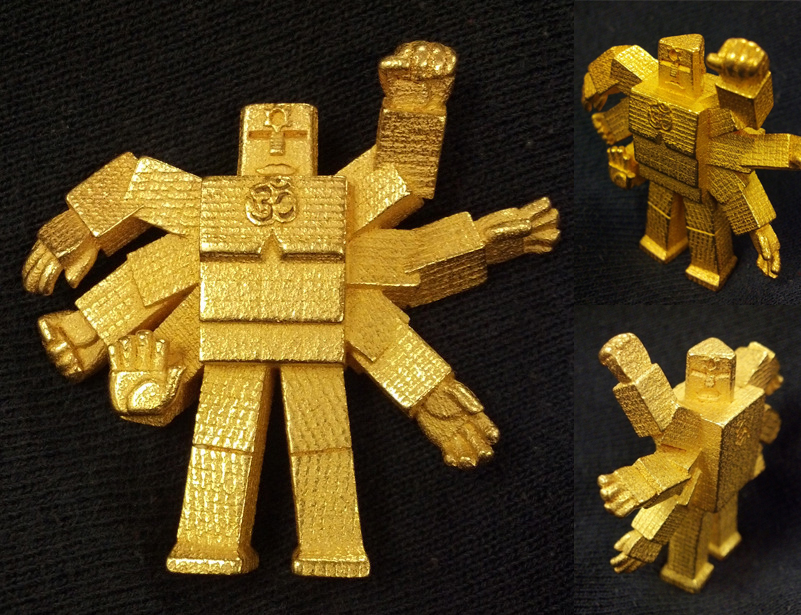 Whilst all of the attention has been focussed on the monumental SpinningHeadSunshine x Spinshine release (find out more here), Sanjeev over at Brown Noize Productions has in no way forgotten the OG Ashura custom… as he reveals the six-armed Ashurashine in a jaw-dropping stainless steel edition! Printed by Shapeways in a gold finish, the weighty, solid metal mini figure weighs in with a whopping $80 price tag. Sanjeev has stated that if he can get enough interest in the piece, he’ll go ahead in producing a small run in the near future using an adapted, deeper detailed sculpt that will be more suited to the viscous material… On the SHS x SS front, all of the first batch of figures have been cast and are being bagged up as we speak- anyone lucky enough to jump on the first wave can expect a Muscle Things PM for solicitation in the very near future!