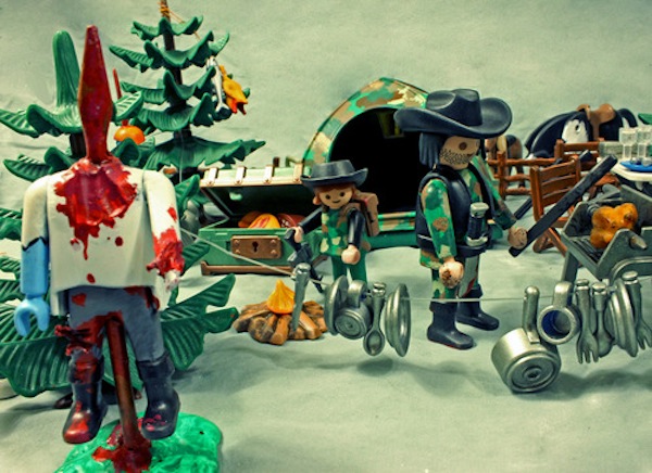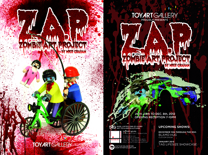 In the wake of last year’s massive series of over 60 customised Playmobil figures (check them out on our old blog here), Mikie Graham is back once again with the return of the Zombie Art Project! Comprising of over 30 zombified Playmobil scenes including a fun assortment of affordable single zombies, some more intricate midsize playsets, plus a GIANT 3ft x 3ft diorama, the figures are set to become part of Graham’s debut show at the prestigious TAG. Opening November 24th at the LA gallery, Graham will be on hand from 7-10pm to talk toys, art and of course zombies! Any remaining pieces will be available through the TAG online store the following weekend. Stay tuned for a full preview over the next couple of days…