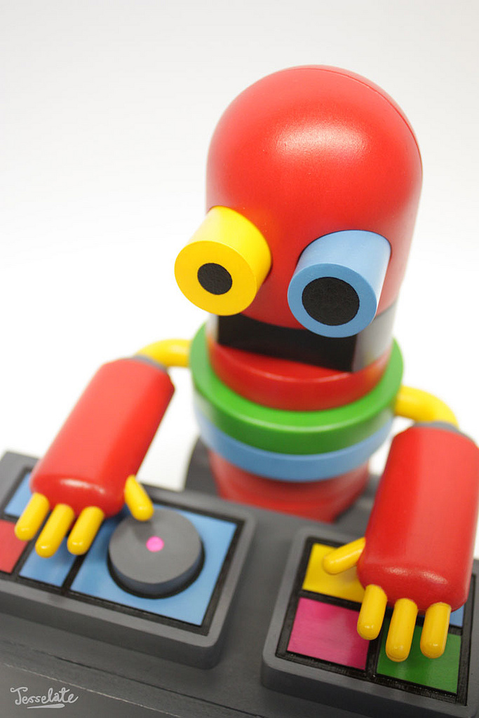 After a brief hiatus from the art toy scene, UK artist Tesselate is back with possibly his most ambitious release to date… the ED-IT DJ’s- B5100 robot! Standing at a lofty 6.5″ tall, the multi-parted, accessory laden figure (check out that turntable!) is due to come hand painted in Tesselate’s signature blend of bright, almost Mondrian like colours… No news on pricing or availability on the little fella as of yet, so be sure to stay locked for more news as soon as we get it!