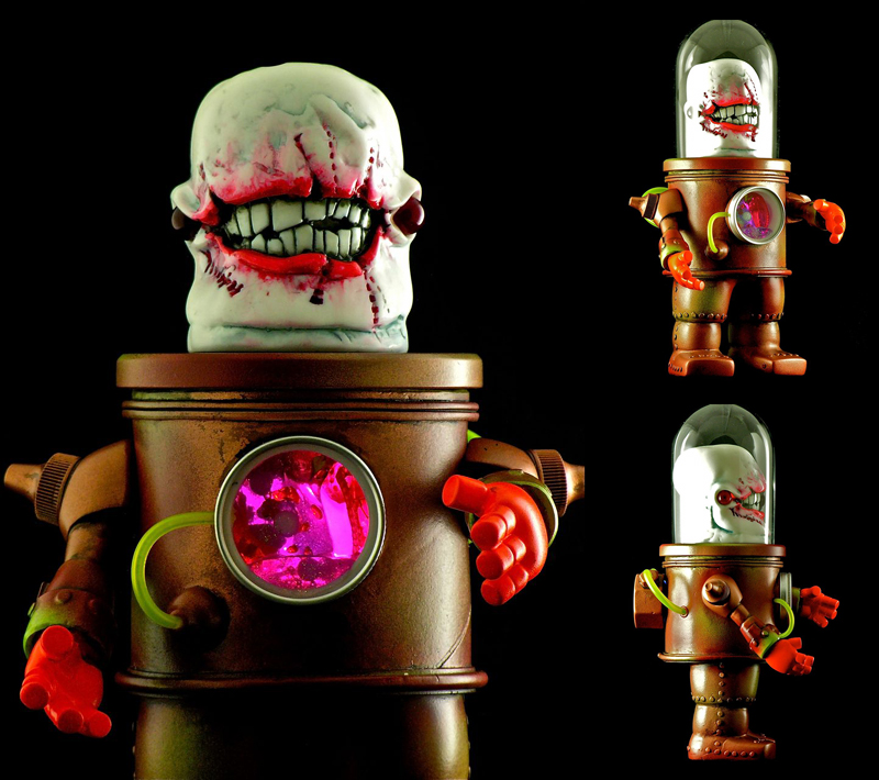 Bob Conge aka Plaseebo kindly shares details of the second figure to feature in the on-going Misfits custom series, the jaw-dropping “GNAW” robot… Standing at a lofty 9″ tall, the hand cast resin piece features yet another all-new head sculpt (originally previewed here) sat on top of the standard Misfits body chamber. Once again filled with a magical mix of slowly moving gel colours and shapes that are illuminated from the back by a switched, colour changing LED unit, the monstrous GNAW even comes with a removable glass dome. Due to touch down in the Plaseebo store on November 30th, expect to pay upwards of $600 for this amazing one-off piece…