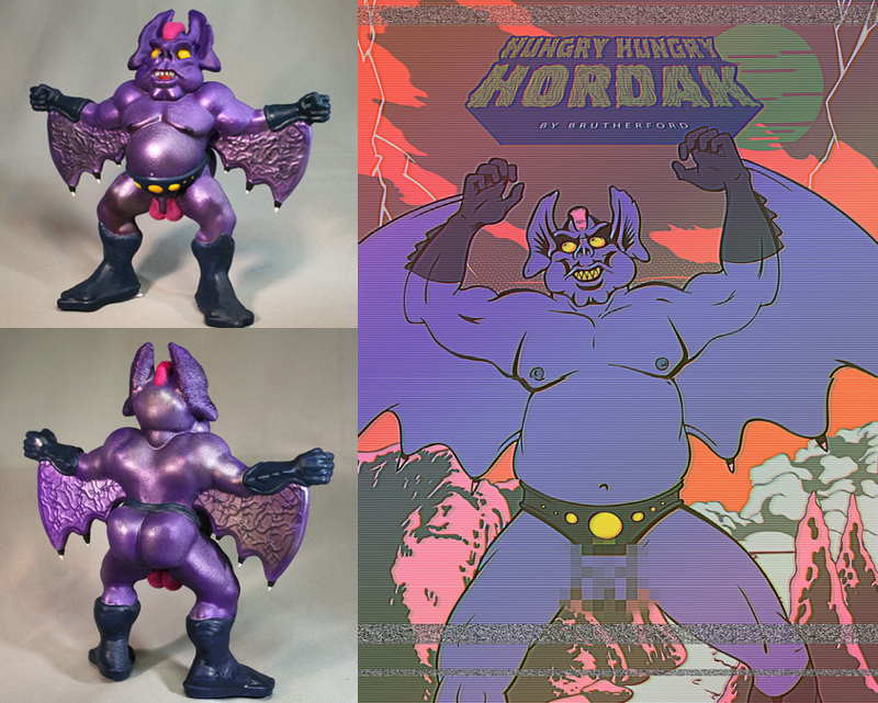 Saving quite possible our favourite piece until last, we are very proud to present Brutherford Industries‘ entry into Clutter’s (In)action Figure Show… the ‘giant’ Hungry Hungry Hordak! Based on his design for our very own H.U.S.T.L.E Artist Series (check him out here), the stunning piece was upscaled to 7″ and 3D printed as a one-off custom piece. Featuring the same ‘grape’ coloured finish as the Clutter exclusive H.U.S.T.L.E figures that should (hopefully!) also be available at the show, the piece even comes with a pair of flocked balls and mohawk! Packaged in an authentic blister style header designed by David Ayllon, the piece will also be accompanied by an 18″ x 24″ poster limited to just 10 pieces…