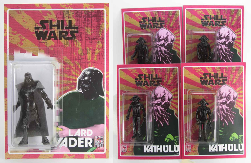 We’ve been meaning to feature up and coming custom bootleg artists Bombermat Toys for quite some time, so what better way to start than with the awesome figures currently available in their shop… the ‘Shit Wars’ Lard Vader and Kathulu Yuppie! Comprised of various 3.75″ action figure parts kit-bashed with original sculpting, our favourite out of the 2 has got to be the rather portly Vader… a perfect homage to the fat nerd, that all of us as toy collectors keep buried deep down inside (some a little more than others!). Packed in authentic blister style packaging, both hand cast resin figures can be found on the Bombermat Toys store here for just $35 a piece… Stay tuned for a look at the guy’s latest figure, the Phantom Lord, later this week!
