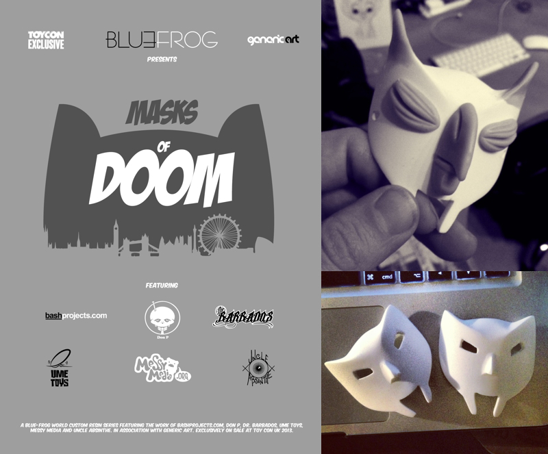Gary Boon over at Blue-Frog World kindly shares details of his first ever custom resin series, the rather intriguing ‘Masks of DOOM’… Designed to be used in conjunction with the various custom toy platforms out there (the design was first seen at MunnyWorld 2011), or as a stand alone piece, Gary has plans to offer the unique resin up in 2 different forms; a raw DIY version that is due to retail for a wallet friendly £7.50, plus a limited custom run from 6 artists around Europe. Featuring UME Toys (pictured), Don P, BashProjects.com, Messymedia, Dr. Barbados and Uncle Absinthe, each have been given 2 masks to work on, the results of which will be debuting alongside the DIY version at this year’s ToyConUK. Stay tuned for more news as soon as it hits…