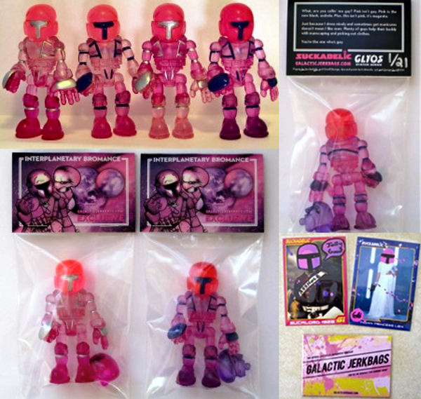 Originally teased a few weeks back, the Sucklord‘s unofficial fanclub, Galactic Jerkbags, are proud to fully reveal their latest exclusive release… the Interplanetary Bromance Glyos! A three-way collaboration between Suckadelic, Onell Design and GJ, the super limited series consists of a custom translucent Pheyden Glyos run with hand cast resin heads from the Super Sucklord himself. Coming hand dyed and painted by GJ’s Irishmofo in a tribute to the original Gay Empire Homotroopers, each set comes with one purple or silver variant, a bonus dyed Pheydan head, a GalacticJerkbags.com promo card, plus header designed by MDCN. Limited to just 21 pieces (7 of which have already been reserved by GJ members), the Interplanetary Bromance 2 packs will be available through the GJ blog from Saturday, February 2nd at 5pm PST, priced at just $40 shipped (within the US).