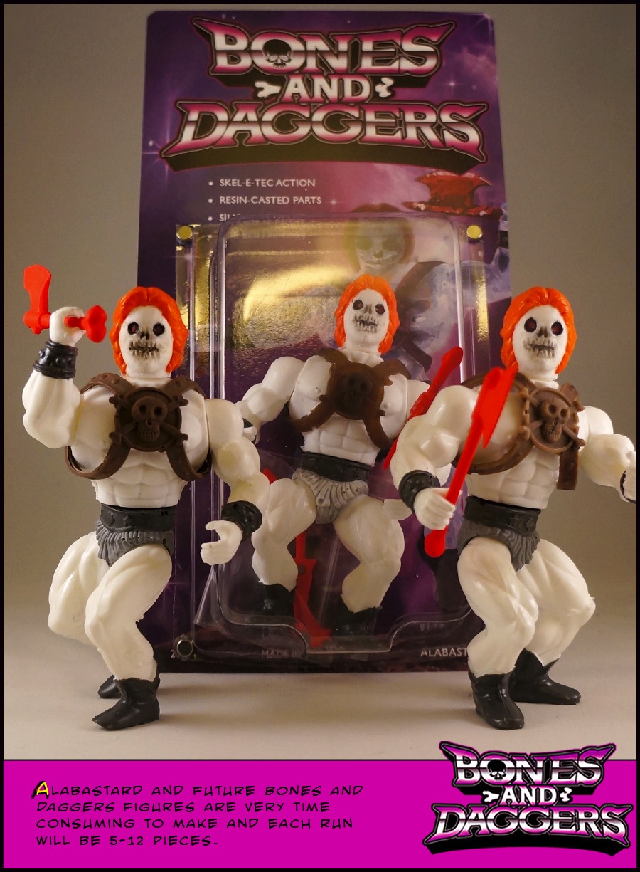 New ‘KO’ inspired custom bootleg line ‘Bones and Daggers‘ is set to receive it’s first release this week, as we proudly reveal to you guys the awesome Alabastard… A tribute to Herr Bone from the infamous ‘Flex-A-Tron’ line, the figure has been kit-bashed from a Galaxy Warrior body and modified AWA Larry Zybysko head, coming complete with digitally sculpted armour and weapons. Beautifully hand cast with both rubber and resin parts, steel-eyelet articulation, and durable nylon accessories, the figure comes housed in an equally extravagant 2-sided color printed UV coated card and removable magnetized bubble. Priced at $140 plus shipping, Alabastard will be available via e-mail (bonesndaggers@gmail.com, subject ‘Alabastard’) from Friday, February 8th at 12pm PST. Be sure to head over to the blog here for the full rules and conditions… We understand that the next 2 B&D figures are already cast up and raring to go, so expect to hear more from this promising line very soon!