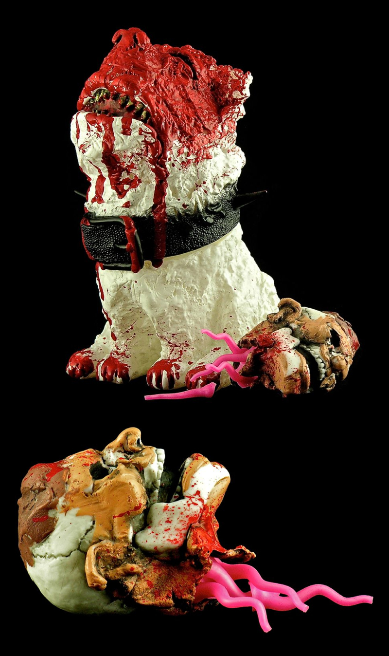 The ever elusive Kaiju Coup is back once again for the latest incarnation of Warui Inu, with the bloody ‘FETCH’ edition easily the most gruesome version yet… Cast in a white soft vinyl by Medicom Toys, the creepy hound stands at 6 1/2″ tall, this time around coming with a hand sculpt and resin cast “FETCH” accessory, a severed head resin head that was first seen in the recent Rampage Molezilla custom. Offered up once again via lottery, anyone interested in entering is going to need to send their name, address and e-mail to kaijucoup@gmail.com before Wednesday, February 13th. The lucky winners can expect to pay $220 plus shipping…