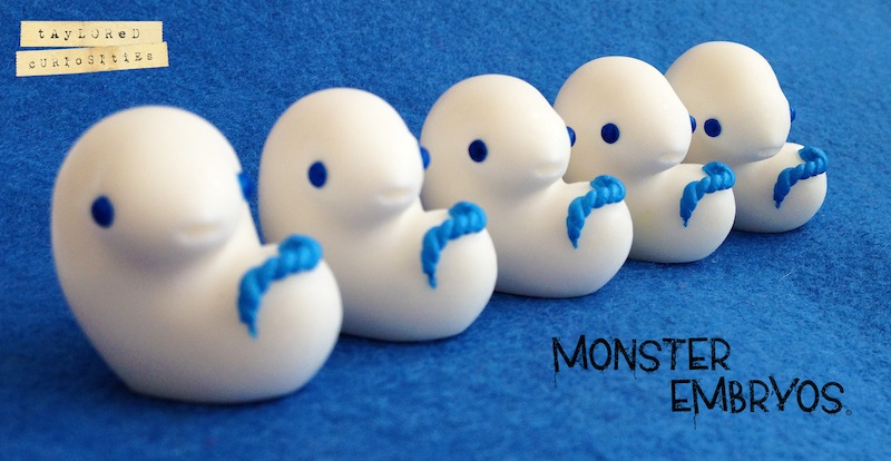 It’s been a little while since their last appearance, but Taylored Curiosities‘ Monster Embryos are back, and this time around coming in a beautiful ‘Winter’ White! The fifth colourway in the hugely popular micro figure series, the 1″ tall piece has been cast in resin by TC’s Penny Taylor, coming complete with hand sculpt and painted blue umbilical cord and eyes. Limited to just 7 signed and numbered pieces, the Winter White Monster Embryos will be available at 5pm (GMT) on Tuesday, February 12th from the Taylored Curiosities store for just £10 each plus shipping…