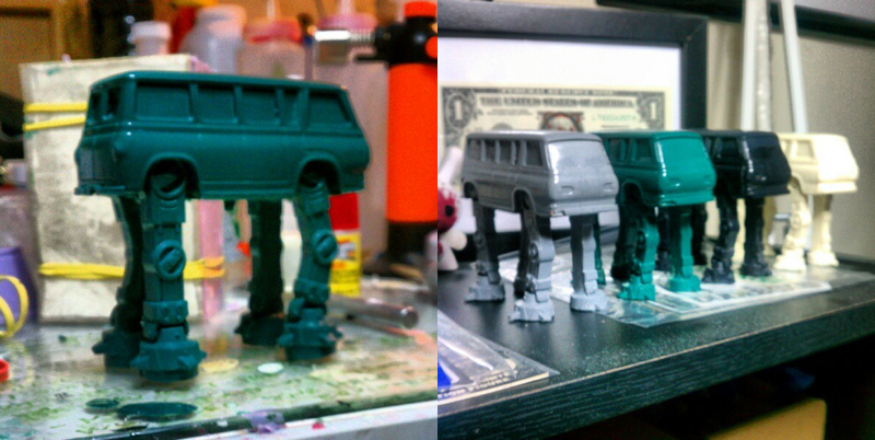 Custom bootleg artist 2bitHACK comes with his latest (and quite possibly greatest!) figure yet, the “Empire’n on a Budget” mash-up! Kit-bashing the legs of Star Wars’ iconic AT-AT walker with a Ford Econoline, the hilarious 3″ tall piece has been cast in a variety of different resin tints including the standard Grey, Army Men Green and Black. Currently available to pre-order in a blank, custom friendly white through the newly opened 2bitHACK Storenvy, “Empire’n on a Budget” can be yours for just $40 plus shipping…