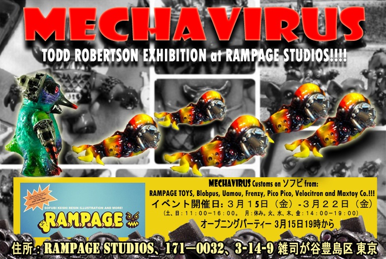 Jon over at the newly opened Rampage Studios is proud to present the gallery/shop space’s second art and toy event, the Todd Robertson aka Mechavirus Custom Show! Featuring a number of customs from the kaiju king of mecha, including pieces from RAMPAGE TOYS, Uamou, Blobpus, Frenzy, Pico Pico and Maxtoy Co, the various sofubis will also be joined by a special ‘Rampage’ painted run of Robertson’s popular Ammonaito resin. Opening it’s doors on Friday, March 15th at 7pm, any of the show’s remaining pieces will be heading to the online store the following week. Stay tuned for a full reveal soon…