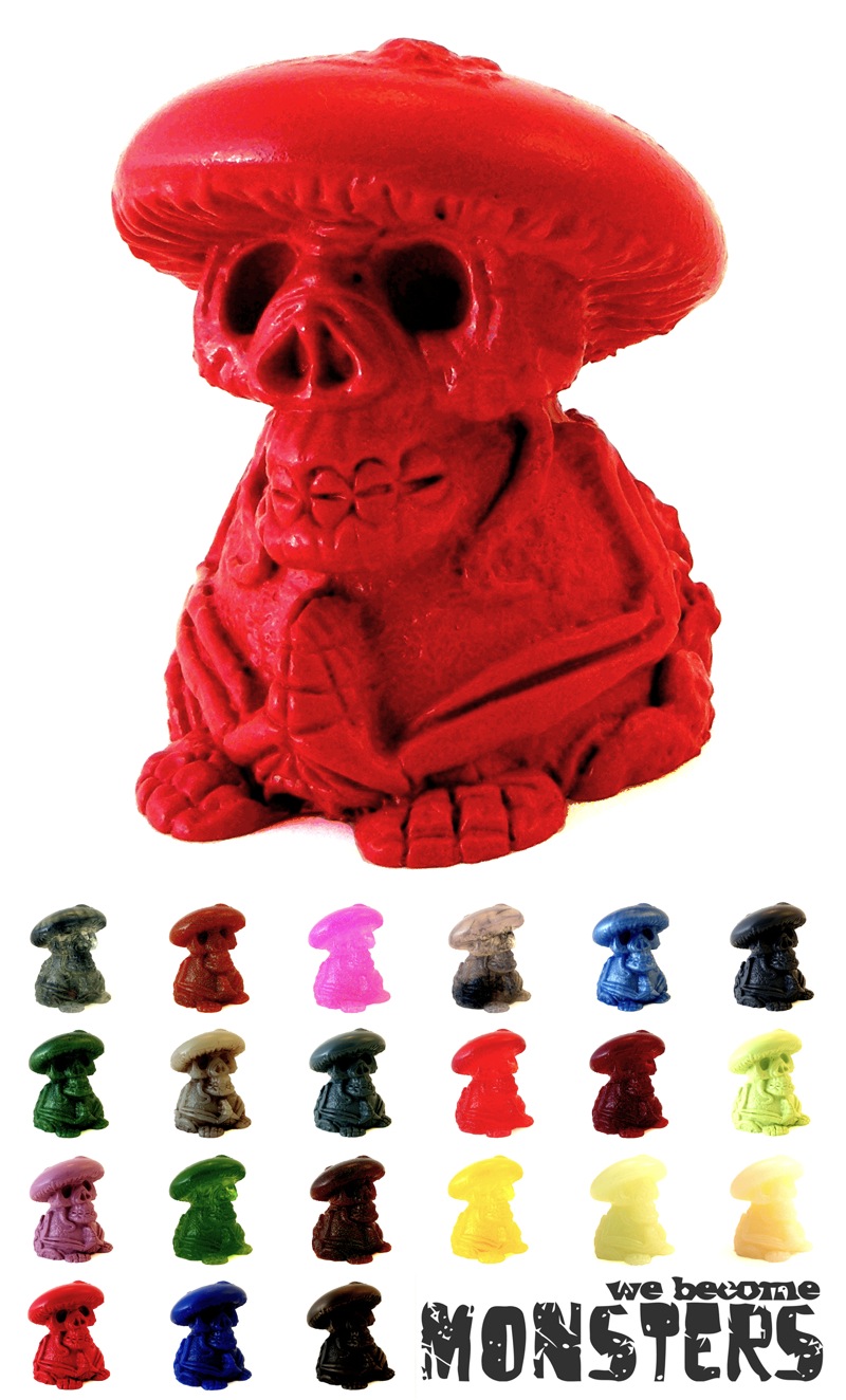 Originally created as part of the Dead Hand x Tenacious Toys Resin is King: Series 2, Chris Moore over at WeBecomeMonsters has just revealed that his “Amanita Must Scare Ya” Death Cap resin is now set for it’s first stand-alone release! Standing at around 3″ tall, Chris will be offering up 3 different versions of the figure across and edition of 26; 4 Glow-in-the-dark, 4 cold-cast bronze and 18 one-off colourways. Priced at just $25, $45 and $22 respectively, the little guys will be hitting the WBM store on Thursday, March 7th at Noon Eastern time… Chris has stated that all orders will also include a completely FREE micro resin SLAB (whilst stocks last), plus entry into the random drawings for a full sized version!