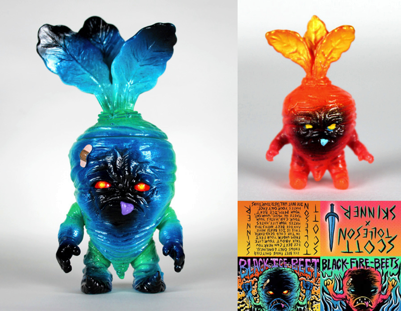 Scott Tolleson teams up with Skinner for the release of the latest batch of Deadbeet customs, as he proudly presents “Black Ice” and “Black Fire”… Sprayed in Skinner’s signature mix of metallic blue, green and black with contrasting firey red and yellow detailing, the 7” tall Black Ice sofubi has been limited to just 10 pieces, priced at $150 each plus shipping. Alongside the soft vinyl release, Skinner has also got to work on a batch of Baby Deadbeet PVC mini figures too, with the appropriately titled Black Fire coming in a gorgeous blend of gold, red and black sprays. Free to anyone lucky enough to bag the bigger version, another 20 will also be up for grabs at just $30 each… Black Fire and Black Ice touch down in the Stolleart store this Friday, March 8 at 10am PST.