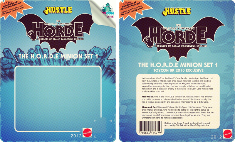 With ToyCon UK looming ever closer, we decided it was about time to start revealing the TON of exclusives we’ll be bringing along… and what better way to start than with our latest H.U.S.T.L.E collaboration? Teaming up with Man-E-Toys regular Ironmask, we introduce the line’s first sub brand, the mighty H.O.R.D.E: Hundreds of Really Dangerous Enemies! Designed and sculpted by Ironmask, the first batch is due to feature 3 different figures; ‘Mer-Mace’, ‘Man & Eel’, and leader, Horde-Ape, each steeped in the same MOTU-infused lore as the main H.U.S.T.L.E series.
