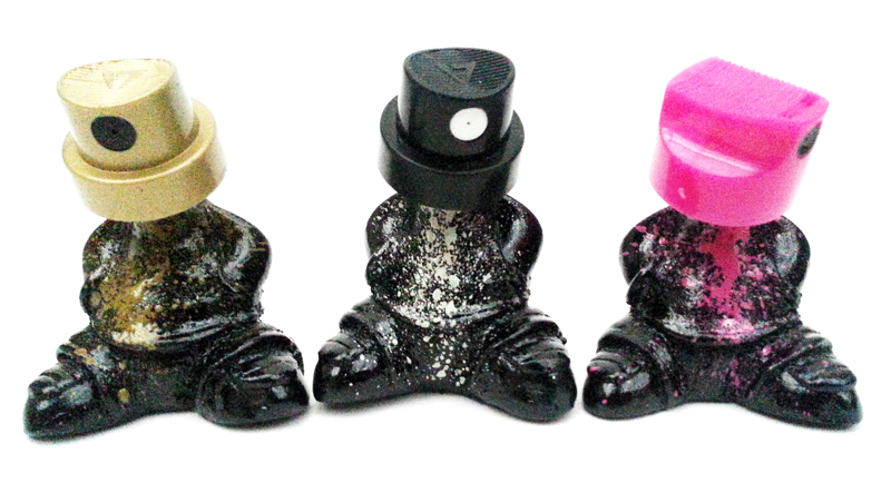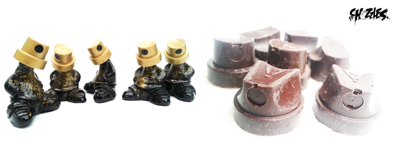 Teased here just last week, UK graffiti artist Hoakser kindly shares details of his latest original figure design… this time around coming in fully edible chocolate as well as resin! Standing at around 2″ tall, the standard plastic edition comes hand cast, sanded, drilled, glossed and sprayed by the artist in a number of different colourways, featuring either ‘clean’ or ‘dirty’ fully articulated ‘nozzle’ heads. Packaged with a sticker and unique laminated art card, the first ‘Pink’ wave has just touched down in the Hoakser store for just £6 plus shipping, with a limited supply of ‘Gold’ to follow soon… Now on to the important part of the release- the chocolate! To coincide with the launch of Hoakser’s upcoming ‘CHOZZLES‘ (chocolate nozzles), he will be offering chocolate versions of Vandalface to the first few purchasers of the figure! Cast using a food grade silicone mould, the little guys are made of a delicious mix of 70% dark and raspberry pieces… Graffiti, toys and chocolate, what’s not to love?!