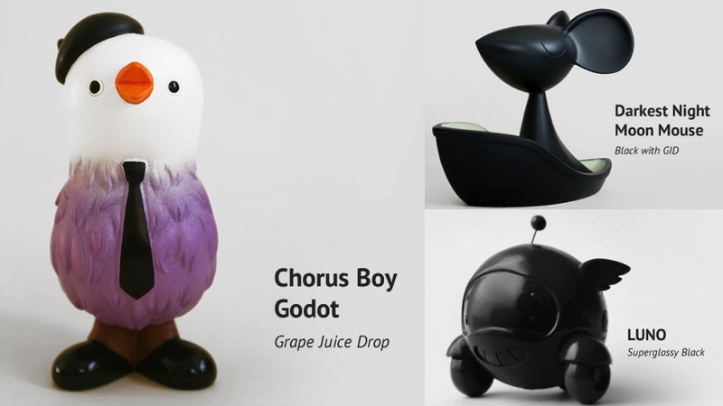Whilst unfortunately unable to make ToyConUK in person next week, Russian toy artist Sergey Safonov has created a number of new releases, collaboration pieces and even prints that will be available at various booths- the first of which to be revealed coming in the form of 3 exclusive colourways for UK designer toy emporium, The Hang Gang. Consisting of a ‘Grape Juice Drop’ Chorus Boy Godot, a ‘GID’ Darkest Night Moon Mouse and ‘Super Glossy Black’ Luno, each piece has been hand cast and painted by the artist, coming in extremely limited quantities. Pricing on the pieces is still forthcoming, but Safonov has stated that any remaining stock will be headed to the Hang Gang online store soon after the con.