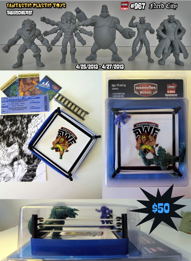 With C2E2 and an imminent debut just around the corner, the guys behind upcoming wrestling mini figure line ‘Mystical Warriors of the Ring‘ have finally revealed the full contents of the first limited edition box set… and boy are we in for a treat! Featuring the 2″ Ulric Wolfrom and 2.3″ ‘giant’ Goliath cast in resin by Marty ‘Godbeast‘ Hansen, the C2E2 exclusive package also comes with a 2″ scaled wrestling ring with UV resistant mat and GID ropes, fabric ring apron, plastic ladder, set of trading cards, a b/w mini comic, commemorative event ticket and clamshell box! Priced at an extremely reasonable $50, the set will be available in either metallic green/purple, Aztek gold or thermal colour changing Green-Yellow… Head over to the dedicated blog here for a comprehensive Q&A for the full lowdown.