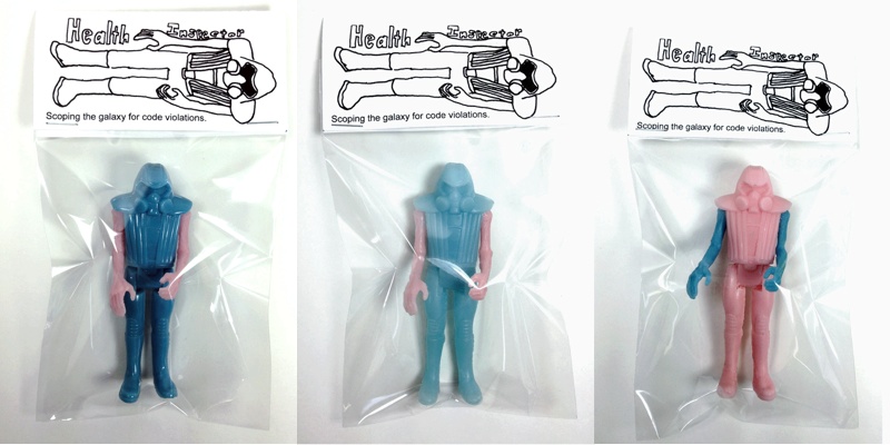 Andrew Geddes of Green Plastic Tunnels has teamed up with Novelty Haus for the release of his debut resin figure, the HEALTH INSPECTOR! “Travelling the galaxy scoping for code violators”, the awesome Tron kit-bash stands at around 4″ tall coming with zero points of articulation. Hand cast in a mix of light pink, light blue and blue resin, the figure has been limited to just 10 mixed-part pieces. Available on the Novelty Haus store right now, the bagged and custom headed HEALTH INSPECTOR can be yours for just $15 plus shipping…