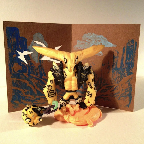 Previously featured here as a work in progress sculpt a couple of month back, Brooke A Allen‘s latest resin mini figure, simply titled “CUD”, is finally upon us! Markedly bigger in scale than previous efforts at around 2″ tall, the fearsome beast has been hand cast in a number of different one-off colourways, each coming hand painted with GITD highlights. Quickly becoming standard with all of Brooke’s releases, CUD features a number of removable accessories including a salamander display base and incredible chained mace… Limited to just 10 pieces this time around (with a further 5 available for trade), each comes bagged with a custom signed and numbered header/background element for just $16 plus shipping. Check them out in the Brooke of Allen store right here!