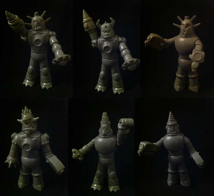 After a whopping 14 months on the drawing board, Any Old Ion‘s labour of love, the ‘Japanese Ion Men’ modular sofubi have finally been revealed in near-finished factory sample form! Consisting of a staggering 51 different soft vinyl cast parts designed by A.O.I in conjunction with turboPISTOLA, the series features a number of interchangeable pieces inspired by previous A.O.I releases ‘Atomic Beartank’ and ‘Seismic Ace’, Spanky Stokes’ Stroll, plus a number of all-new designs from the pair. Cast in a soft Japanese vinyl by none other than Velocitron, we should hopefully be seeing the first release soon… We’ll be interested to see whether the line will be offered up as a set of individual parts or as fully assembled bots, and of course, how colour will be dealt with considering the interchangeability factor- the possibilities are limitless! Either way, this will be one series any diehard ‘bot fan will NOT want to miss…