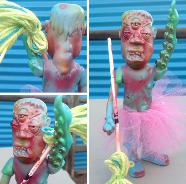Toys Are Sanity’s Coma21 continues his onslaught of ‘Ian the Sewer Creep’ collaborations as he proudly presents the latest painted run from none other than Dski One… Taking inspiration from cult 80’s horror The Toxic Crusader, the tutu wearing ‘Toxie’ has been been painted up in a mixture of green, red and blue sprays, coming complete with mop accessory from Lulubell’s Amy! Dropping in the Lulubell Toys store this Wednesday, May 1st, the Toxic Avenger Sewer Creep has been priced at a very reasonable $60 plus shipping…