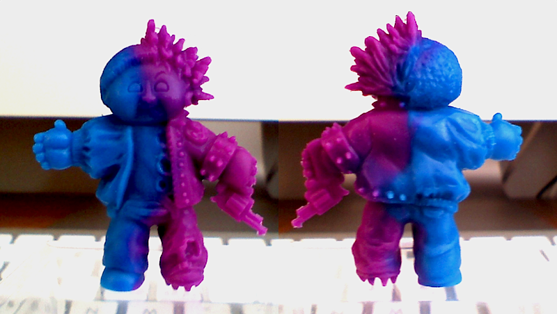 With ‘Kit Month’ coming to a close, Alec over at Muscle Things proves there’s still a ton of life left in NolanJP’s Split Kit, as he comes with the latest (and greatest!) colourway yet… the gorgeous 2-Tone! Based on the split-personality GPK character of the same name, the GPK Cheap Toy scaled figure has been double cast in a rather apt Novo Blue and Punky Purple using Alec’s infamous ‘black magic’ rubber. Unfortunately we still have no news as to whether this little guy (or other 2-Tone variants for that matter) will be hitting the Muscle Things store any time in the near future, but you can be sure that as soon as we hear anything, you guys will be the first to know!