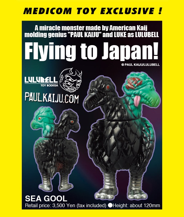 The Paul Kaiju x Lulubell Toys Seagool sofubi heads East as Medicom present the ‘Flying to Japan’ edition! Cast in a glossy black soft vinyl, the 12cm tall beast has been hand sprayed in a mix of teal and silver sprays, coming complete with pink, red and white detailing. Priced at just 3,500yen (approx. $35), Seagool is up for pre-order through the Medicom store right here up until Sunday, June 30th. Shipping is planned for late August…