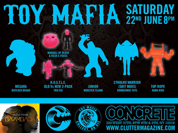 Clutter Magazine‘s 3rd Toy Mafia at Concrete NYC, June 22rd 2013, 8pm-late… For more info, head over to the dedicated Facebook page here. Remaining pieces after the event will be heading to the Clutter online store here on Monday, June 24th…
