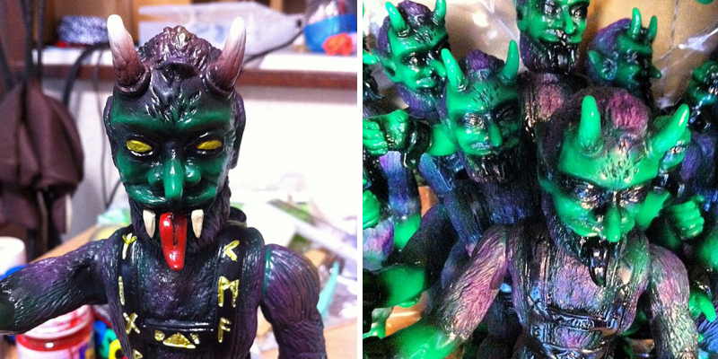 Created just in time for the monster Splurrt x Blobpus show this coming Friday, July 5th, Jon Malmstedt over at Rampage Toys is proud to present his latest custom collaboration… taking on Krotpong’s devilishly good Krampus sofubi! Based on the infamous horned ‘baby snatcher’ taken from German folklore, the latest run has been cast in a bright green soft vinyl (with a few GID chases), featuring metallic purple and black sprays with yellow, red and white detailing from Jon. Expect to see these guys up in the Rampage Toys store this Saturday, July 6th at 11am Japan time (10pm Friday EST) for an undisclosed sum…