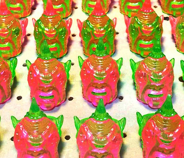 Lulubell Toys are proud to reveal that the elusive Cyclonator resin ring sets from Japan’s Omiso Factory will be making an appearance at SDCC in exclusive pink/green colourway! Featuring a beautifully sculpted (albiet kind of creepy!) faced ring design with detachable magnetic mask, the 2 pieces have been meticulously hand cast in contrasting, crystal clear resins. Word on pricing and edition size are still to be confirmed, but we’re guessing you’ll be able to find these at the Lulubell x Velocitron booth for around $40 each… Interested in picking up the ring, but can’t make the con? Then you’ll be glad to know that the standard blind-assorted version is still available to pre-order through the Lulubell Toys store right here.