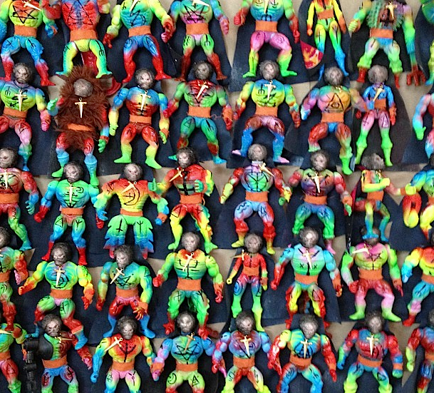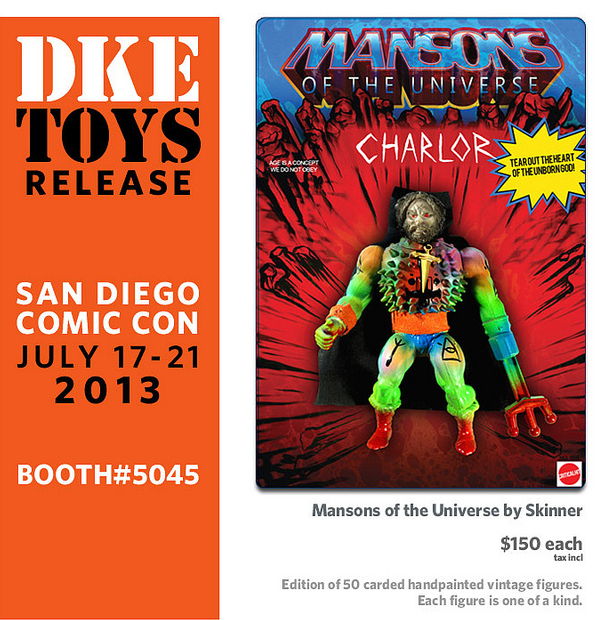 Previewed here a couple of weeks back, Skinner‘s latest foray into the world of custom bootlegs, the Mansons of the Universe, has finally been revealed in full! Unlike previously thought, each of the edition of 50 figures has been created using actual vintage 5.5″ toys instead of resin castings- resulting in the diverse range of one-off freaks you see below! Replete with dagger pendant, cape, and hand cast resin head sculpted by the Skin Man himself, each figure has been hand finished in a unique mix of psychedelic sprays and brushed detailing. Packaged on an awesome MOTU inspired backer, the Mansons of the Universe will be available from the DKE Toys SDCC booth on Friday, July 19th at 11am for $150 each…
