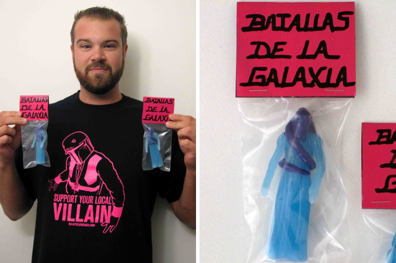Galacticjerkbags.com, the unofficial Suckadelic fanclub, have revealed that they will be making an appearance at SDCC this year, and whilst they don’t have a booth per-say, the site’s Minister of Propaganda, Irishmofo, will be lurking around the con from Preview Night to Sunday, slanging “Support Your Local Villain” shirts from his backpack for $20 a pop in either black or purple! But that’s not all… He and fellow jerkbag Derrick (aka galacticjerkbag66), have teamed up to smuggle some poorly made bootleg “Galaxy Battles” figures from Mexico! Limited to only 6 pieces, these hand cast resin figures come bagged with a handmade header card. The best part of all? They’re totally FREE! Just bump into Irishmofo at any time during SDCC and ask for one, if he still has one, then it’s yours… They even come stamped “Rejected” on back by the US Customs, so you know they really suck!