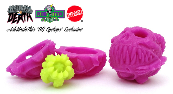 As promised in our big reveal earlier today, we’re very proud to present the second Madball of Death exclusive to be rearing it’s ugly head at the Cardiff Tattoo & Toy Con next week… the “OG Cyclops” edition for the one and only AshMadeThis! Taking inspiration from the original AmToys Cyclops Madball, the 3-part figure has been cast in a day-glo purple with lime insert, coming with the now standard magnetic contacts that hold the gruesome sections together. Packed with absolutely stunning header art from the master tattooist himself, the figure has once again been limited to 10 pieces, priced around £30-£35 each… But that’s not all! Ash twisted our arm into securing yet another exclusive, so be sure to come back later this week for the full lowdown…