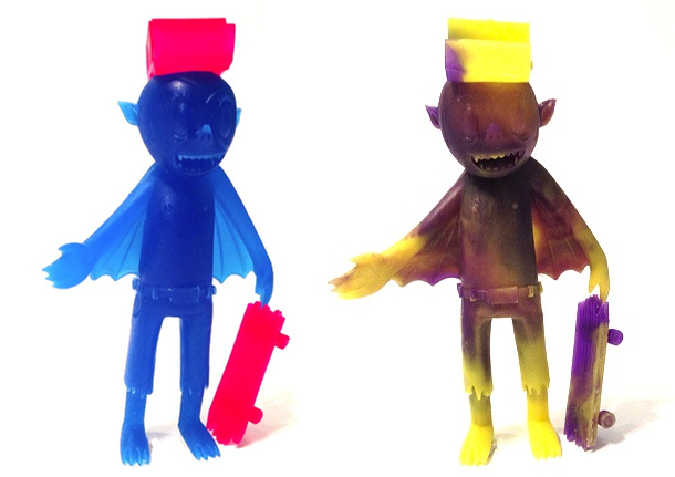 Blurble is very proud to present that his latest resin figure, the mischievous Sparrow, will be making his debut at SDCC later this week! Designed by Blurble, sculpted by ERA Sculpture‘s Josh Sutton, and produced by DuBose Art & Design, the super hard-wearing resin figure has been cast in 2 different colourways for this initial run; a Blue/Pink UV reactive variant, and a Neon Yellow/Purple swirled mix. Coming with removable hat and skateboard accessories, both editions have been limited to 7 pieces each, priced at a very reasonable $20. Going on sale at the Lulubell Toys SDCC booth this Friday between 1-3pm, any remaining stock will hit Blurble’s online store soon after…