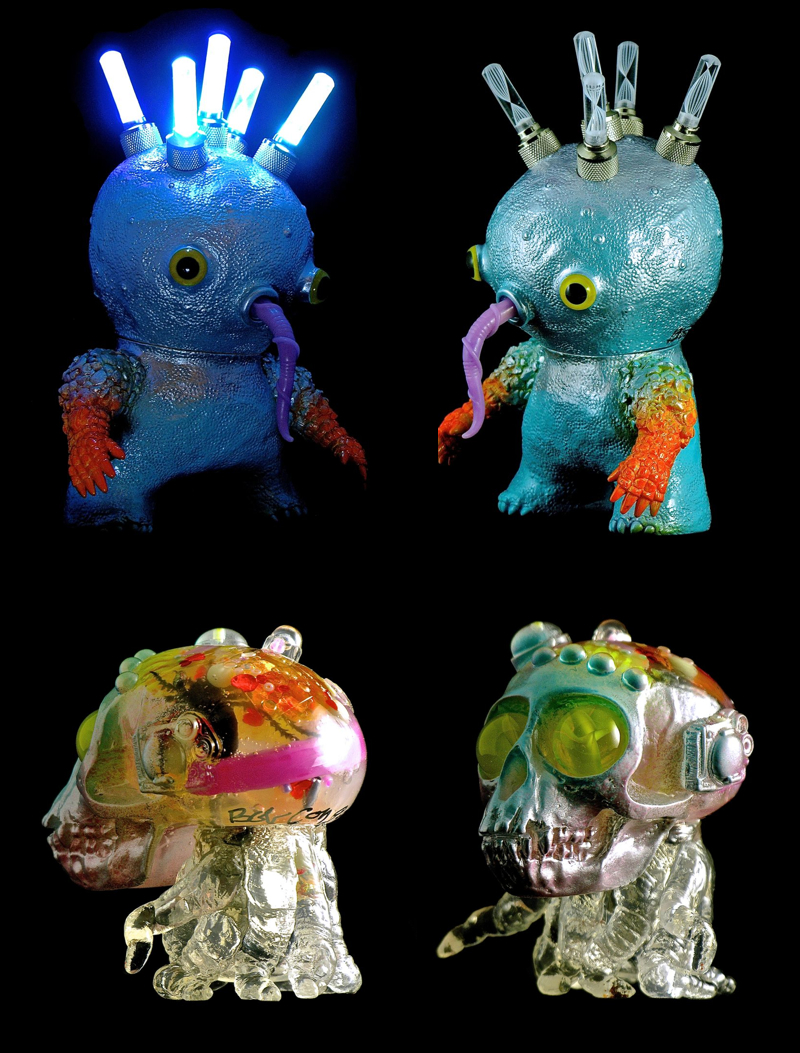 Joining the previously featured custom Android, Bob Conge aka Plaseebo comes with his latest 2 pieces for FOE‘s upcoming “Creatures” show! First up we have the Isotope Night Gamer… The latest iteration of Conge’s bulb headed sofubi, the teal cast soft vinyl figure has been modified with 5 colour changing motion activated LED units, dolls eye inserts and a purple worm tongue. Finished with a number of contrasting sprays, the stunning piece has been limited to just one… Sitting alongside the Night Gamer, Conge will also be offering up the latest Skulloctopus from Outer Space. Another one-off piece, the clear cast soft vinyl figure has been adorned with a mix of metallic blue and pink sprays, coming filled with space debris floating in asteroid slime and an internal motion activated LED unit. To be joined by a number of other pieces from Conge, plus works from BLObPUS, Yamomark, GUUMON and Hanawa, both the Skulloctopus and Night Gamer will be up for grabs at the show’s opening next Friday, August 9th from 6pm onwards… Stay tuned for more reveals next week!