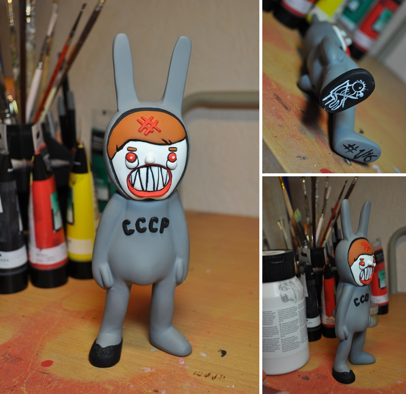 Avant garde resin whizzkid Patient No. 6 delivers yet again with his latest masterpiece, simply titled “BOY”… Standing at an impressive 9” tall, the figure, based on a photograph of the artist as a young boy, has been sculpted in the same loose but charming style we’ve all come to know and love. Complete with rabbit suit, a single shoe and a rather angry looking face, BOY has been painted in a stunning mix of flat grey, black, red and white tones that really play to the figure’s minimal style. Limited to just 17 pieces, BOY can be found in the Patient No. 6 store right now for just $66 plus shipping.