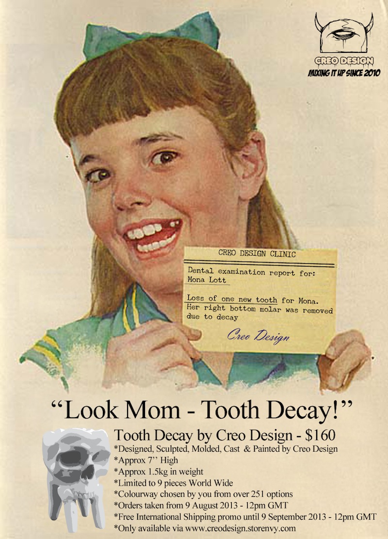 Originally teased here back in June, Chris Alexander of Creo Design has finally taken time out from his busy schedule of collaborative projects to release his first ever resin figure of his own design, the gruesome Tooth Decay… Measuring a whopping 7″ high and 5″ wide, the impressive piece is due to come cast solid in Creo’s own unique blend of resin, with adoptees being able to choose from over 250 custom colours for the main body and 40 for the individual teeth! Dropping in the Creo store this Saturday, August 9th at 12pm GMT, Chris will be offering up Tooth Decay for an introductory price of $160 shipped until September 9th, after which shipping charges will occur and the price will increase to $195… Better get in quick!