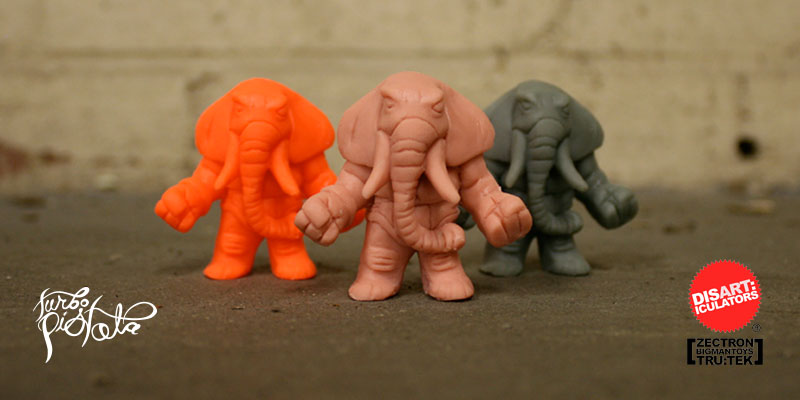 Originally teased as super-limited preview runs for both Wonder Festival and CT&TC last month, Elephantos: Keshi Edition is finally set for general release later today (08/16)! Marking the first collaboration between our very own Tru:Tek and the enigmatic turboPISTOLA, the 2″ tall mini figures have been cast in a wonderful, squishy rubber at The Disarticulators studios right here in merry ol’ England, with 3 colourways initially up for grabs; Flesh (ltd 10), Grey (ltd 5) and Neon Orange (ltd 5). Packaged in a resealable clamshell blister with full colour card back and 3″ die-cut vinyl sticker, Elephantos: Keshi Edition will be touching down in the turboPISTOLA store at 9pm EST for a very reasonable $25 plus shipping…
