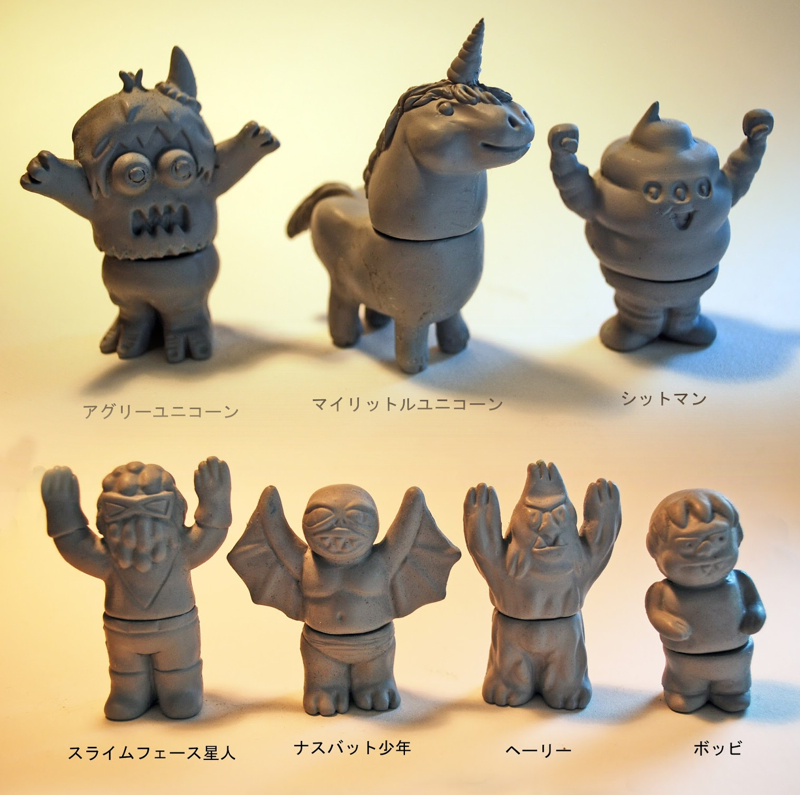 With the likes of Superfestival, NYCC, Design Fiesta and Dcon fast approaching, Jon Malmstedt over at Rampage Toys has decided it’s about time to reveal his all-new line up of sofubi that’ll be making an appearance… presenting the Gachapin Goblin micros! Consisting of 7 1.5″-2″ tall Gachapon-ready figures, the little critters have been designed by Rampage Toys, Joseph Harmon, Walter Parenton (IV – Bobbybeast creator) and Art Junkie, with sculpting duties headed by Jon, Joseph Harmon, and AJ’s official prototyper. The first figures to be retooled and wax cast in-house at Rampage Studios, metal moulds for sofubi casting are currently being finalised for the first regular release at Superfestival on September 29th.