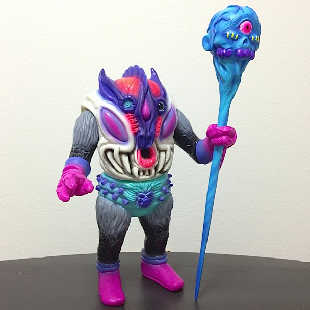 With Paul Kaiju and Toy Art Gallery‘s Pollen Kaiser Custom Show just a couple of weeks away, we thought we’d kick the reveals off with one of our favourites so far… the incredible NecroKaiser from none other than tkom3! Originally covered a few weeks back, the up and coming artist’s unmistakable style returns in spades for this piece, featuring a mesmerising mix of neon fades set against bold black, grey and white blocking. The pièce de résistance has got to be the included staff accessory though, coming completely resculpted in a similar vein to the recently featured ‘Doublethink’ figure- a super-creepy sunken face, sewn up eye lids and a glaring, bloodshot mind’s eye to top things off! Expect more reveals, plus full show details, later this month…
