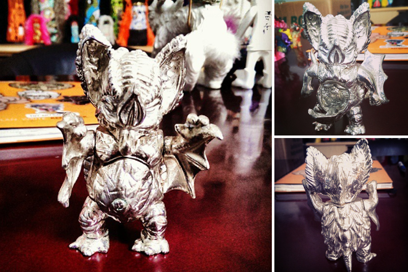 With the highly anticipated Pollen Kaiser group show just around the corner, Toy Art Gallery owner Gino Joukar reveals as piece that is sure to be making it’s debut at the event… Paul Kaiju‘s metal Mockbat! Featuring an all-new miniaturised design, the incredibly detailed piece has been cast in a white metal with silver plating, coming fully articulated with a hatch on his belly that opens up to reveal his innards. With exact details on the figure still forthcoming, we’ll be keeping our fingers crossed for more information as we get closer to the show later this month…