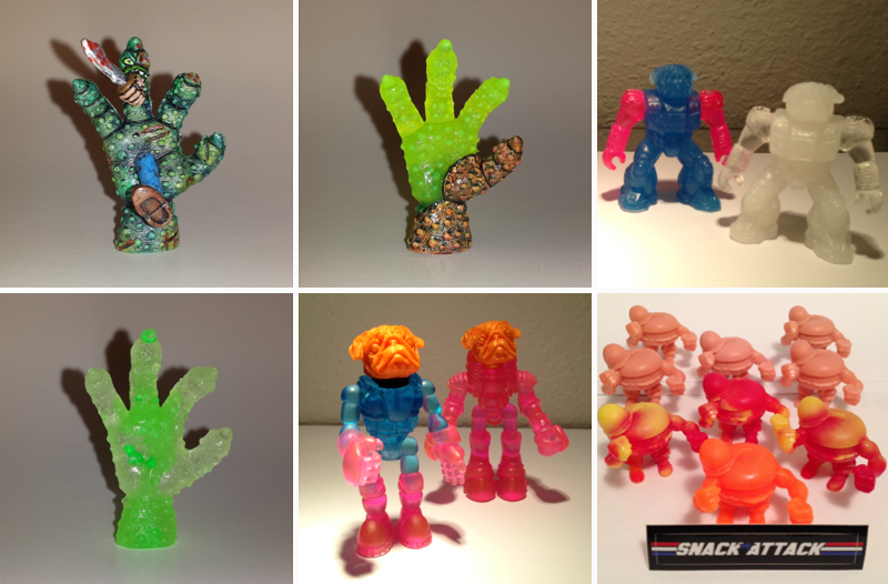 War Pug Battle Beasts// Shrinking the original War Pug head down to mini figure size, Eric has cast up a batch of super-limited custom bootleg Battle Beasts! Cast in a mixture of semi-translucent GITD resins (with one UV chase!), the 2″ figures have been priced at $15 each.