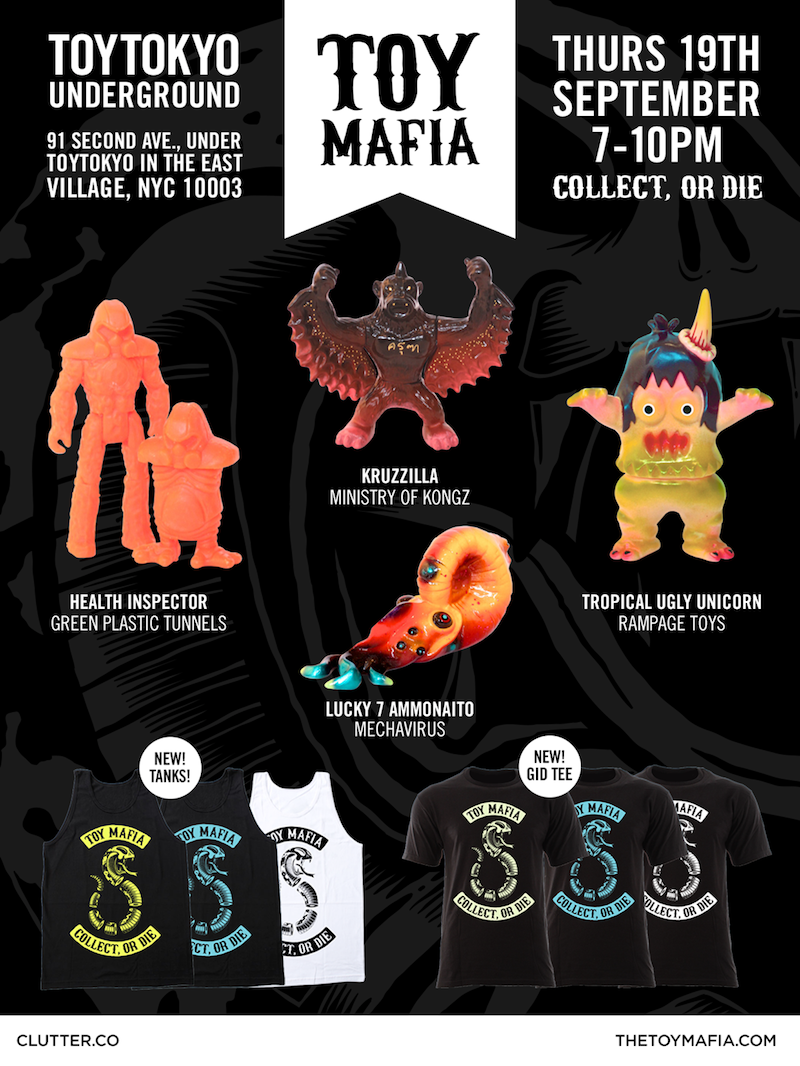 After a brief hiatus, Clutter’s Toy Mafia is back tonight (9/19) with another huge line-up of exclusive toys spanning the bootleg, resin and sofubi scenes! Taking up residence at the legendary Toy Tokyo Underground gallery from 7-10pm, the event will play host to an all-new t-shirt release, free drinks, plus the following exclusives…