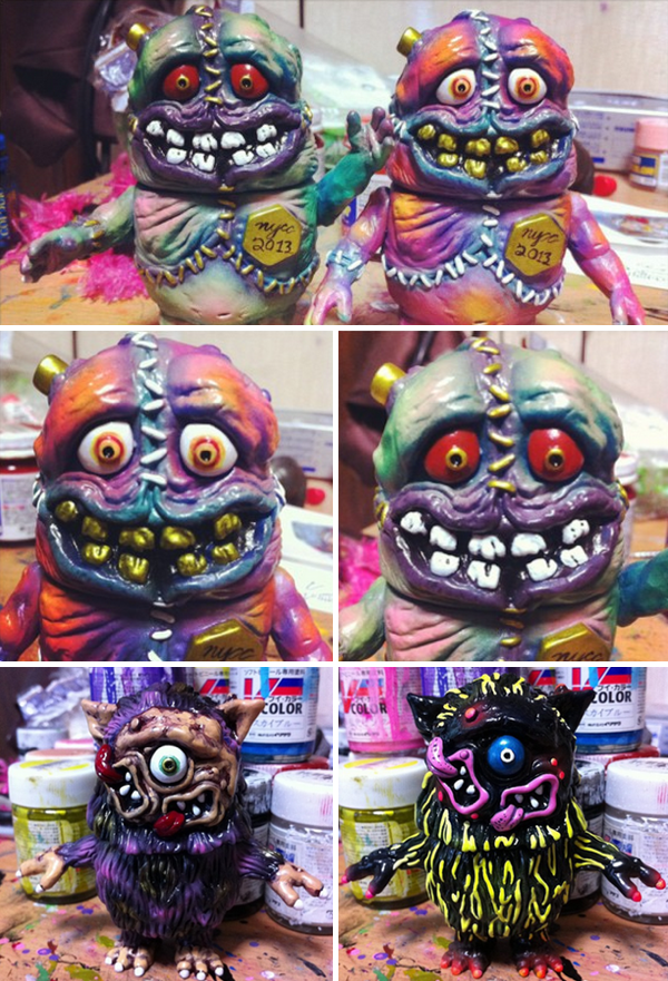 Jon Malmstedt of Rampage Toys has just revealed that he will have a number of one-off custom Cadaver Kids and Digglers at NYCC later this week! Tackling Splurrt‘s soft vinyl platforms in a way only he knows how, the sofubi minis have been treated to a mix of neon VColor sprays, metallic hand painted detailing and some breathtaking gouache brush work. Making their appearance alongside the previously posted Cadaver Twins, the little guys will be available from the Monster Island booth (#504) on Saturday, October 12th at Noon local time. Pricing TBC…