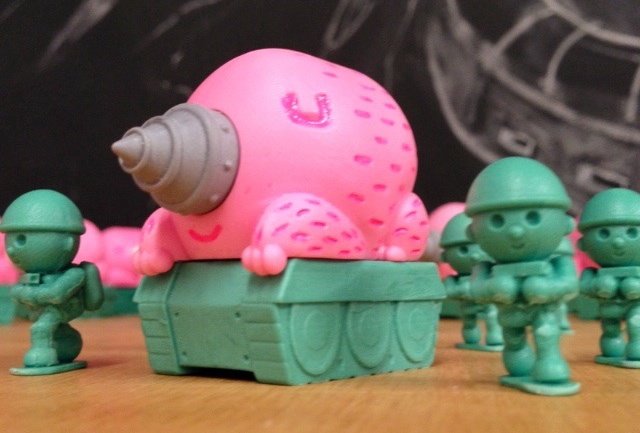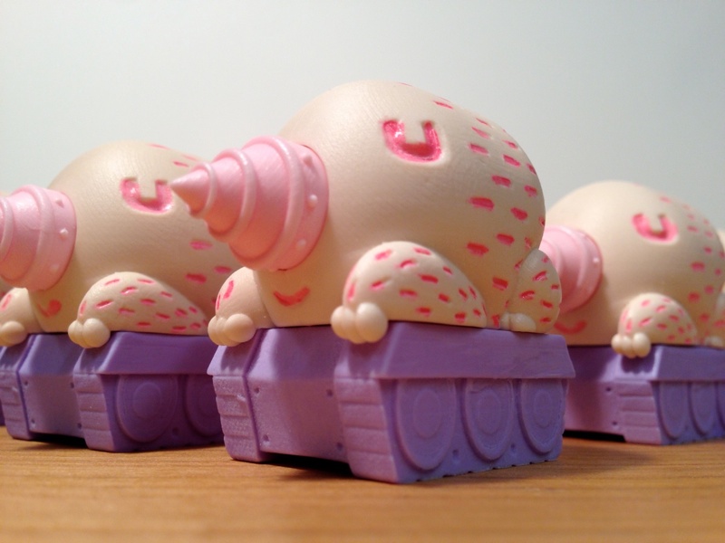 Toy Tokyo exclusive Mogu Tank (Mole Tank)// Peter’s main new figure, the Mogu Tank has been created from a mix of digital and hand sculpting, coming cast in 3 separate pieces with the mole fully removable from the tank base. The first of 2 colourways that’ll be made available at the con, the Toy Tokyo exclusive has been painted in a mix of light flesh, baby pink and baby purple. Limited to just 12 pieces, each coming with a hand made box, the Mogu Tanks will be available for just $30 each. Peter reveals a little about the charcater’s background- “He’s a big Mole Kaiju from the earth’s core caverns rescued, recruited into Earth Defence Army. He had been refitted with a cybernetic drill nose & is carried by a tank tread radio controlled by the Army Jacks… He doesn’t drive. Actually all he mostly does is eat & sleep. The Army have a hard time putting him into action because they’re never sure if he’ll be awake to perform the task needed at those crucial moments. Nevertheless he is a strong, powerful ally against the invading Space Army( first shown with Tako-Cubes & Ninja-Robo ).”