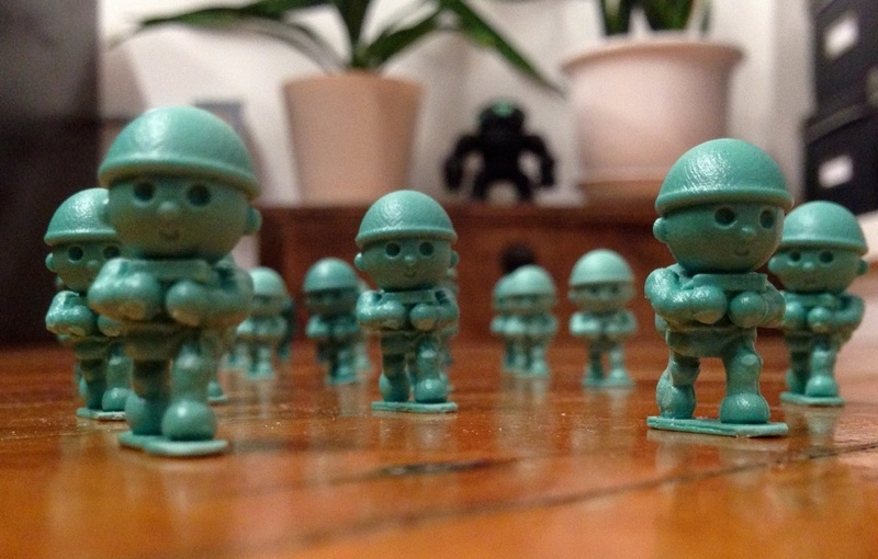 Army Jacks// Showing support for the Mole-Tank come the Army Jacks- “Armed with the task of escorting Mogu-Tank via remote control to the target locations, they are each armed with a flame thrower to protect themselves from any alien invaders during this task.” Digitally sculpted by Peter and cast in a green resin with standing base, the 1″ micro figures will be dropping on the Kato online store this Thursday, October 10th and at the Onell Design booth 4-7pm on Saturday, 1-5pm on Saturday for just $5 a piece.