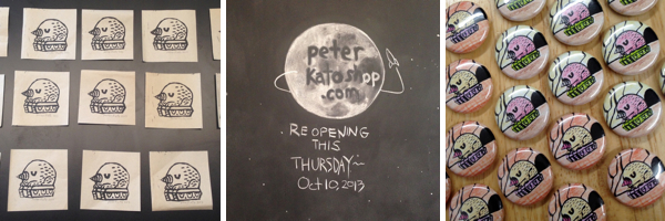Online exclusives// Celebrating the reopening of his online store, Peter will also have a mini “instagram style” linocut print of the Mogu Tank up for grabs too! Blocked with black archival ink on 3×3 inch vintage news print paper, his first hand printed run is limited to 15 pieces, coming signed in the front & numbered on the back. To be joined by a ton of Mogu Tank buttons come Thursday, pricing on the prints is still TBC…