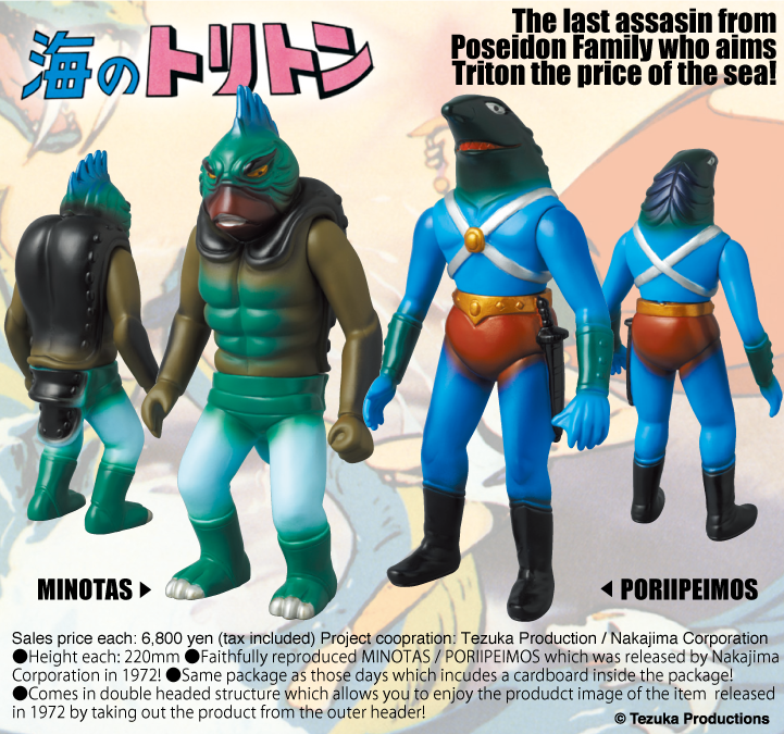 Originally making an appearance back in 1972, Tezuka Productions and Nakajima Corporation’s Minota and Poriipeimos sofubi figures have been rereleased courtesy of Medicom Toy! Taken from the hugely popular “Triton of the Sea” anime that ran right through the seventies, the crazy looking pair have been faithfully reproduced from the original sculpts, standing at around 22cm tall each, with articulation at the head, arms and legs. Packed in an exclusive double header with images of the 1972 release, both Minota and Poriipeimos are up for grabs through the Medicom store for just 6,800yen plus shipping. Interested parties in the West are going to need to fill out the dedicated preorder form right here…