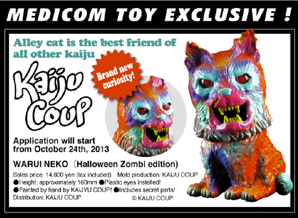 Debuting back in August to instant sell-out success, the elusive Kaiju Coup’s Warui Neko is back for it’s second colourway… the Halloween Zombi edition! Standing at approximately 16cm tall and coming with articulation in the neck, the soft vinyl cast figure has been adorned with a mix of eye catching orange, teal and purple sprays, finished off with inset plastic dolls eyes (and some as yet unrevealed “secret parts”). Currently up for grabs through the Japan Medicom Toy store for just 14,800yen, any collectors in the West are going to need to apply through the dedicated lottery form right here. Closing on November 10th, successful applicants will be informed after the draw on November 18th…